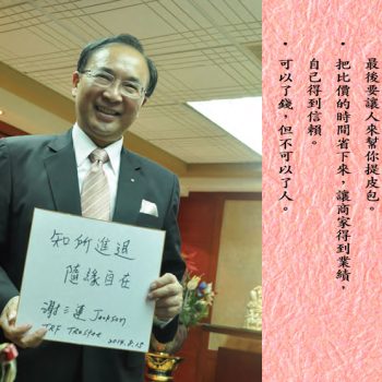 「心存善念,盡力而為」就是在心中想著「台灣因為有我,可以變得更好」這樣就好。Be good at heart, and do your best;台灣雖然沒有豐富的天然資源,但擁有「民主、自由、多元、開放」等進步價值,與亞洲各國相比,非常適合創業,但創業並不保證一定會成功,所以追求創新的第一要素,就是「不怕失敗」。