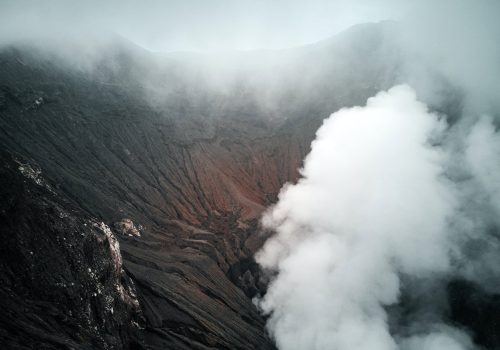 Discover a steaming volcanic crater amid misty mountain surroundings, where nature’s raw power and beauty collide in stunning fashion.